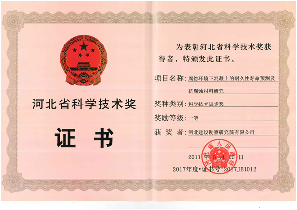 5月30日上午,河北省科學(xué)技術(shù)獎(jiǎng)勵(lì)暨慶祝“全國(guó)科技工作者日”大會(huì)在石家莊舉行。省委書記王東峰、省長(zhǎng)許勤等省領(lǐng)導(dǎo)出席大會(huì),并為榮獲2017年度河北省科學(xué)技術(shù)獎(jiǎng)勵(lì)代表和第十屆河北省優(yōu)秀科技工作者代表頒發(fā)證書。我公司《腐蝕環(huán)境下混凝土的耐久性壽命預(yù)測(cè)及抗腐蝕材料研究》獲省科技進(jìn)步一等獎(jiǎng)、《素混凝土剛性樁復(fù)合地基核心技術(shù)研究與工程應(yīng)用》獲三等獎(jiǎng),聶慶科總工程師代表公司參加了大會(huì)并上臺(tái)領(lǐng)獎(jiǎng)。這是我公司繼2014、2015年度后再獲河北省科技進(jìn)步一等獎(jiǎng),對(duì)我們既是極大鼓舞和肯定,也必將激勵(lì)和鞭策廣大專業(yè)技術(shù)人員,以黨的十九大精神和習(xí)總書記在兩院院士大會(huì)講話精神為指引,積極投身創(chuàng)新實(shí)踐,大力開展科研攻關(guān),為不斷推進(jìn)巖土工程技術(shù)發(fā)展、提升企業(yè)創(chuàng)新能力和核心競(jìng)爭(zhēng)力而繼續(xù)努力奮斗。