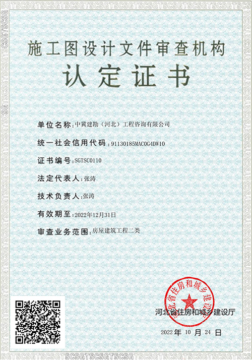 我公司全資控股子公司——中冀建勘(河北)工程咨詢有限公司,于2022年10月24日取得施工圖設(shè)計(jì)文件審查機(jī)構(gòu)認(rèn)定證書,可承接二級及以下房屋建筑工程的施工圖審查業(yè)務(wù)。隨著施工圖設(shè)計(jì)文件審查機(jī)構(gòu)認(rèn)定證書的取得,為我們進(jìn)一步積極開展市場經(jīng)營工作,努力將施工圖審查業(yè)務(wù)打造成為新的經(jīng)營創(chuàng)收增長點(diǎn),提供了新的契機(jī)和基礎(chǔ)。