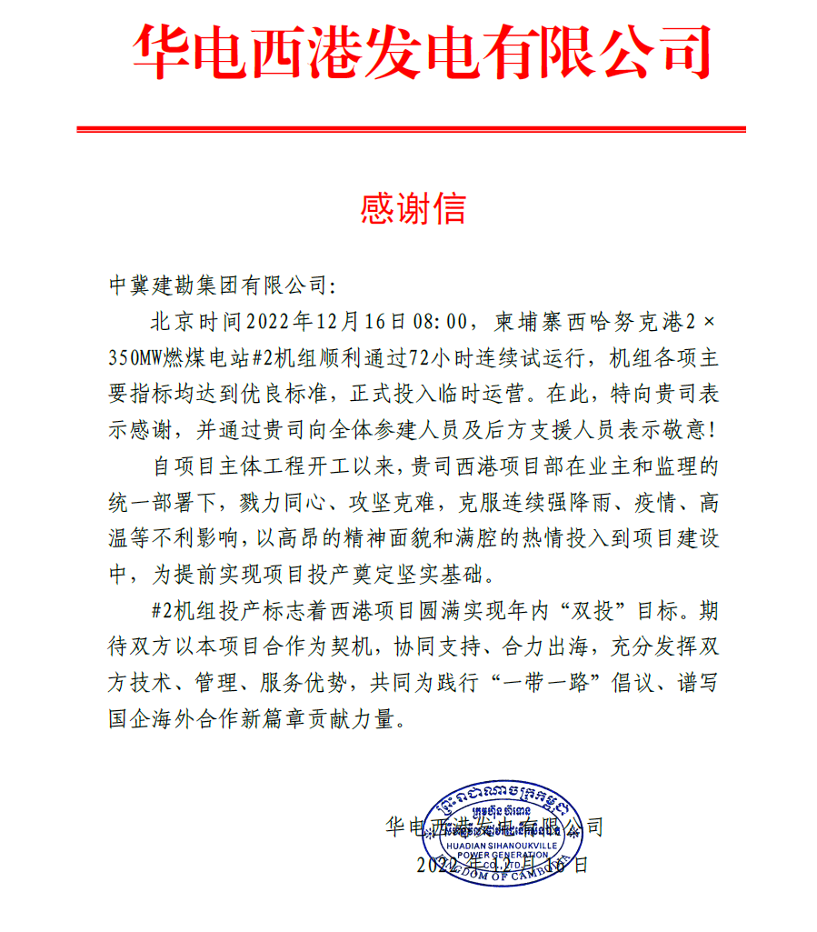 柬埔寨西哈努克港2×350MW燃煤電站#1機組順利通過柬埔寨國家電力公司要求的滿負荷性能試驗,標志著中國華電在柬投資興建的最大火電項目首臺機組正式投產發電。自該項目主體工程開工以來,西港項目部全體人員在業主和監理的統一部署下,勠力同心、攻堅克難,克服連續降雨、疫情、高溫等不利影響,以高昂的精神面貌和滿腔的熱情投入到項目建設中,為項目提前實現#1機組投產奠定堅實基礎。