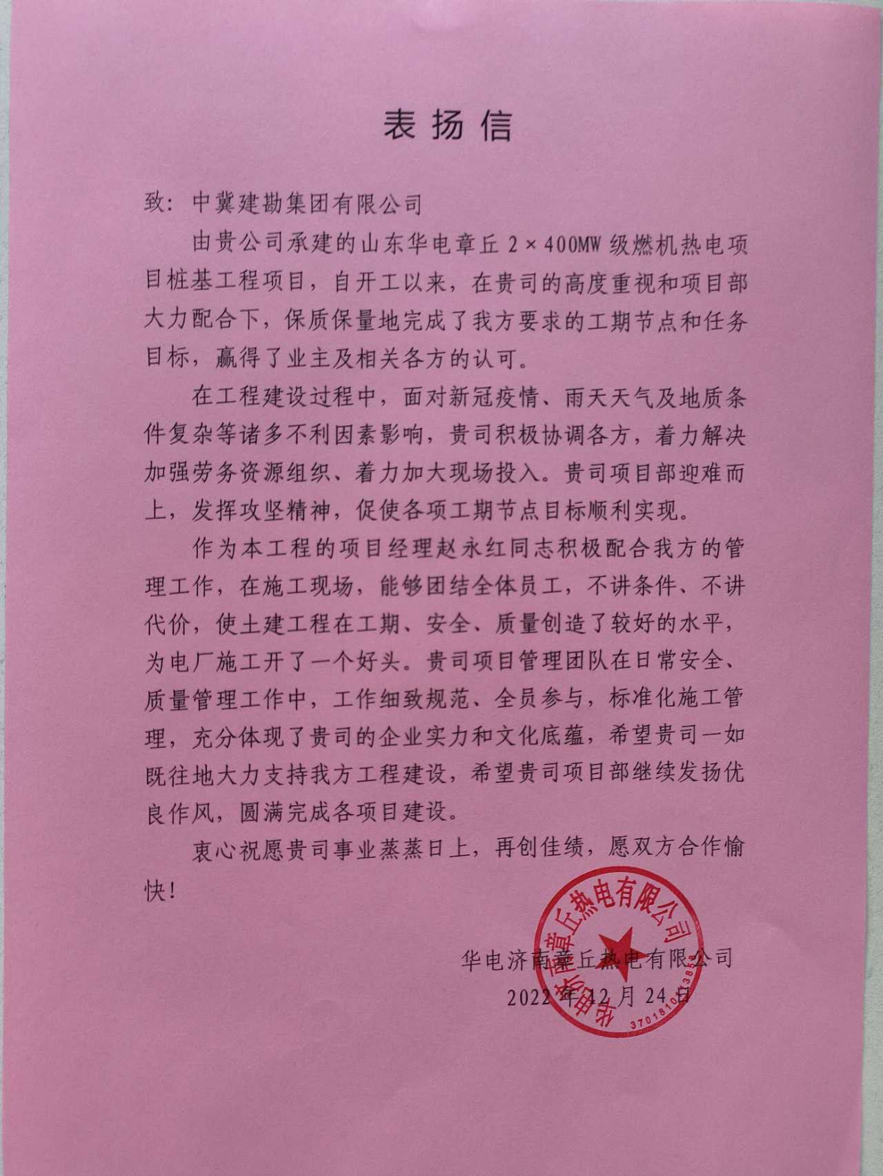 山東華電章丘2×400MW級燃機熱電項目樁基工程,在工程建設過程中,面對新冠疫情、雨天天氣及地質條件復雜等諸多不利影響,在項目經理趙永紅同志的帶領下,能夠團結一致,不講條件,使土建工程在工期、安全、質量創造了較好的水平,為電廠施工開了一個好頭。項目管理團隊在日常安全、質量管理工作中,工作細致規范、標準化施工管理,充分體現了我公司的企業實力和文化底蘊。