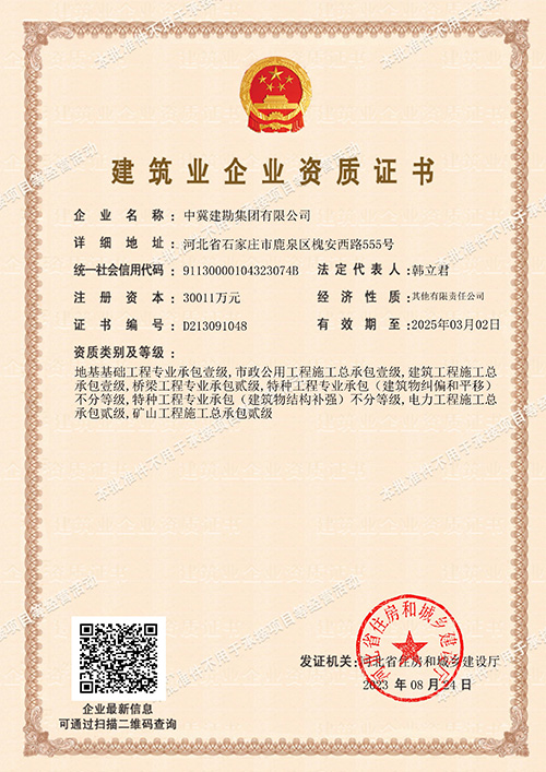 集團(tuán)公司于2023年8月24日喜獲電力工程施工總承包貳級資質(zhì),該資質(zhì)的取得將大力促進(jìn)我公司在電力能源市場的業(yè)務(wù)拓展能力,由電力項目的地基基礎(chǔ)專業(yè)承包向土建、安裝總成承包邁進(jìn),為獨立承接風(fēng)電、光電等電力新能源項目提供了準(zhǔn)入證。