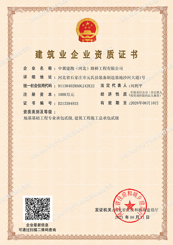 2023年8月11日,經(jīng)河北省住房和城鄉(xiāng)建設(shè)廳審批,中冀建勘(河北)路橋工程有限公司順利取得了建筑工程施工總承包貳級(jí)、地基基礎(chǔ)工程專業(yè)承包貳級(jí)資質(zhì)。