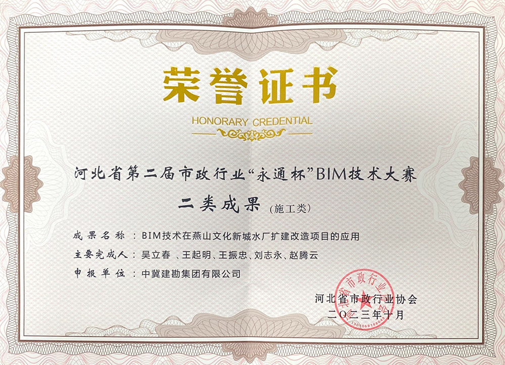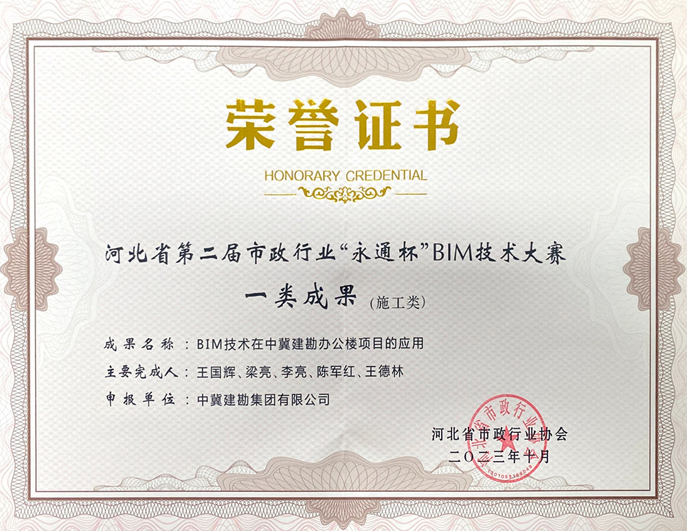 近日,河北省市政行業(yè)協(xié)會(huì)發(fā)文《關(guān)于公布河北省市政行業(yè)第二屆“永通杯”BIM技術(shù)應(yīng)用大賽結(jié)果的通知》(冀市協(xié){2023}37號(hào)),我公司參賽項(xiàng)目“BIM技術(shù)在中冀建勘辦公樓項(xiàng)目的應(yīng)用”項(xiàng)目榮獲一類(lèi)成果、“BIM技術(shù)在燕山文化新城水廠擴(kuò)建改造項(xiàng)目的應(yīng)用”項(xiàng)目榮獲二類(lèi)成果。