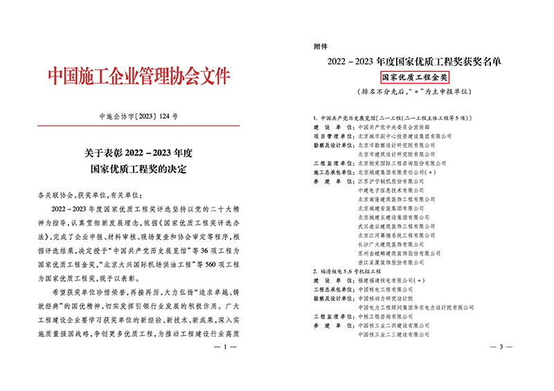 12月9日,中國(guó)施工企業(yè)管理協(xié)會(huì)發(fā)布了《關(guān)于表彰2022-2023年度國(guó)家優(yōu)質(zhì)工程獎(jiǎng)的決定》(中施企協(xié)字[2023]124號(hào)),我公司參與建設(shè)的3項(xiàng)工程獲得國(guó)家優(yōu)質(zhì)工程獎(jiǎng),其中1項(xiàng)工程獲得國(guó)家優(yōu)質(zhì)工程金獎(jiǎng)。