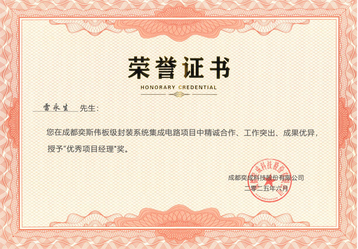 近日,我集團公司榮獲成都奕成科技股份有限公司“優(yōu)秀承包商”榮譽,項目經(jīng)理雷永生被授予“優(yōu)秀項目經(jīng)理”。