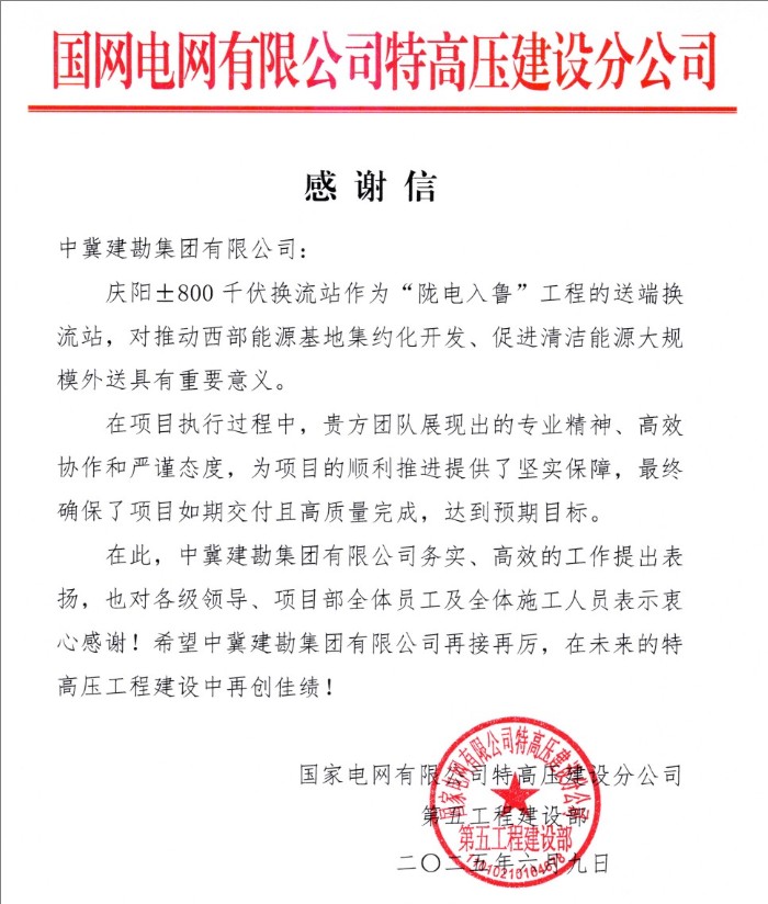 2025年6月9日,在±800千伏隴東-山東特高壓直流工程(簡(jiǎn)稱“隴電入魯”)正式投運(yùn)之際,我公司收到國(guó)家電網(wǎng)有限公司特高壓建設(shè)分公司對(duì)慶陽(yáng)±800千伏換流站項(xiàng)目發(fā)來(lái)的感謝信。信中高度贊揚(yáng)了我公司在項(xiàng)目執(zhí)行過(guò)程中展現(xiàn)出的卓越專業(yè)精神、高效協(xié)作能力和嚴(yán)謹(jǐn)工作態(tài)度。